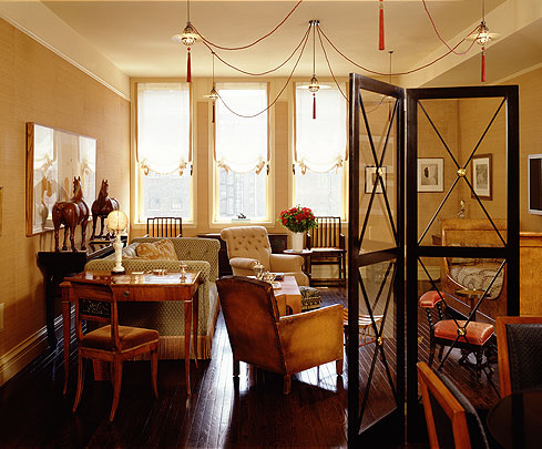 Designer Nicky Haslam used a large Venetian mirror over a mantle where it's simple shape allows the etching in the glass to be the design statement.
